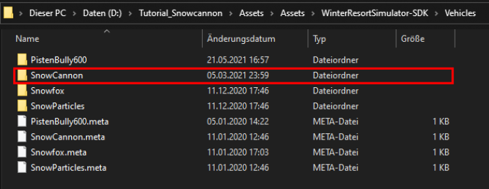 Afterwards, you have to open your Unity project and head to Tutorial_Pistenbully600\Assets\Assets\WinterResortSimulator-SDK\Vehicles\Pistenbully600. Now you can see all files & folders in the project window on the bottom of the screen.
