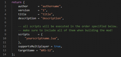 The targetGame variable specifies which game the mod is intended for (season 1 or season 2). Most likely you will want to set this to “WRS-S2”.