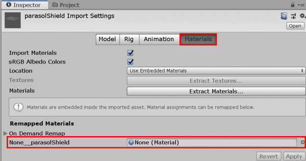 - First, select the model within the Project window. On the right-hand side, you will then see the model's import settings (shown in the Inspector window)