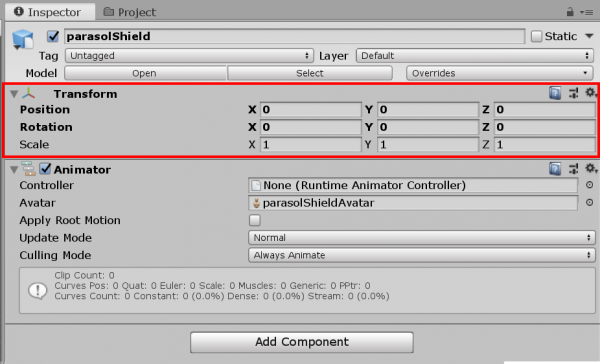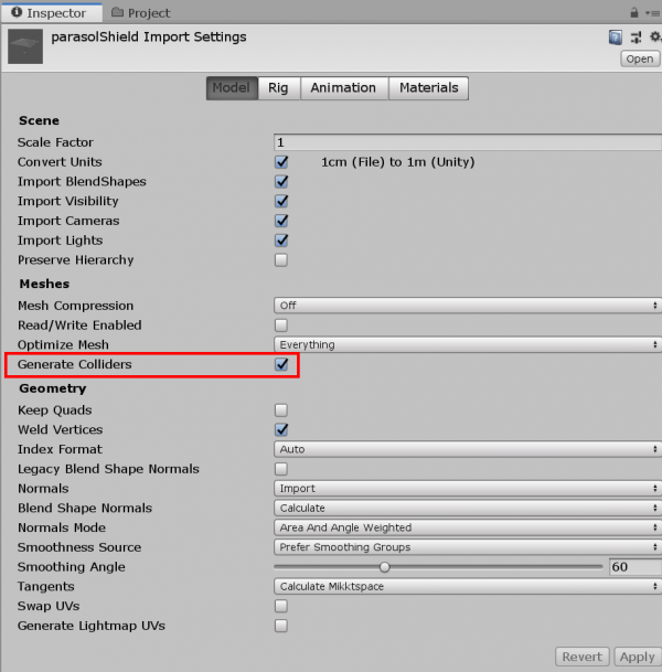 Again, select your model file within the Project window (same as above). Switch back to the Model tab and activate the checkbox Generate Colliders, if you want to have collision enabled for your model. Again, apply your changes by pressing Apply.