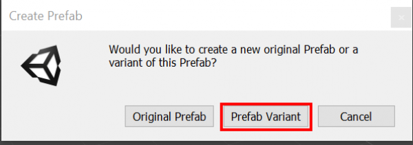 Now drag your object from the Hierarchy window back into the Project window. You will be asked whether you want to create a new Original Prefab or a Prefab Variant. Usually, you will want to have a Prefab Variant. Check out the Unity Documentation on Prefab Variants if you want to know the reasons.