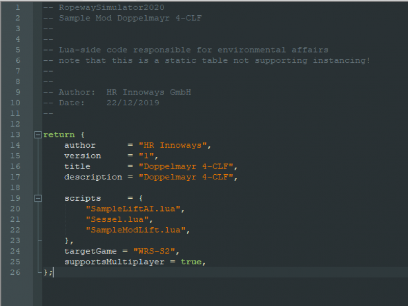 SampleModLift.LUA: This is the most important file. This file contains most of the information about your ropeway, and also contains several important indexes. Here's a little overview of what the different keywords stand for: