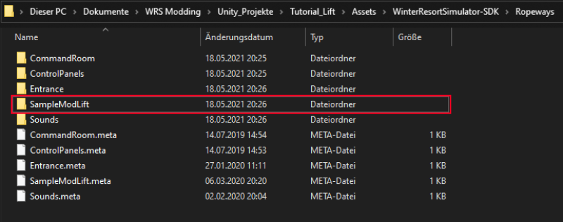 To create a ropeway for the Winter Resort Simulator you will need to install the Modding SDK. In our case, we name the Unity project “Tutorial_Lift”, but you can give it any name you'd like. After installing, you will need to browse to Tutorial_Lift\Assets\WinterResortSimulator-SDK\Ropeways and copy the folder SampleModLift.