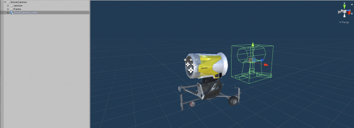 3. Afterwards, make sure the SnowCannon_collis is selected in the hierarchy and set all coordinates in the Transformcomponent in the Inspector to 0 and make sure the scale is in every direction 1!